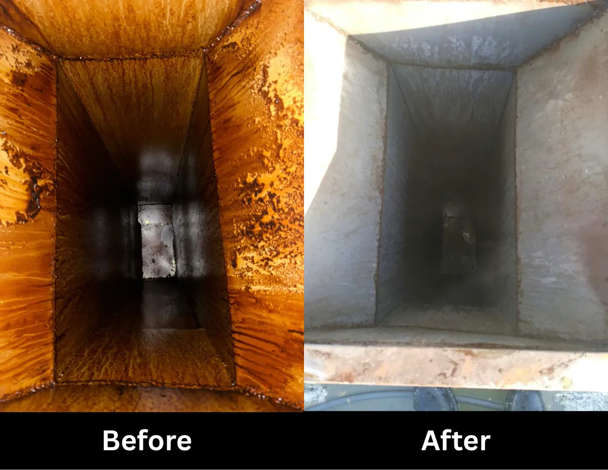 We use professional, food-safe degreasers specifically formulated for commercial kitchen exhaust systems. These powerful chemicals break down years of baked-on grease and carbon deposits.